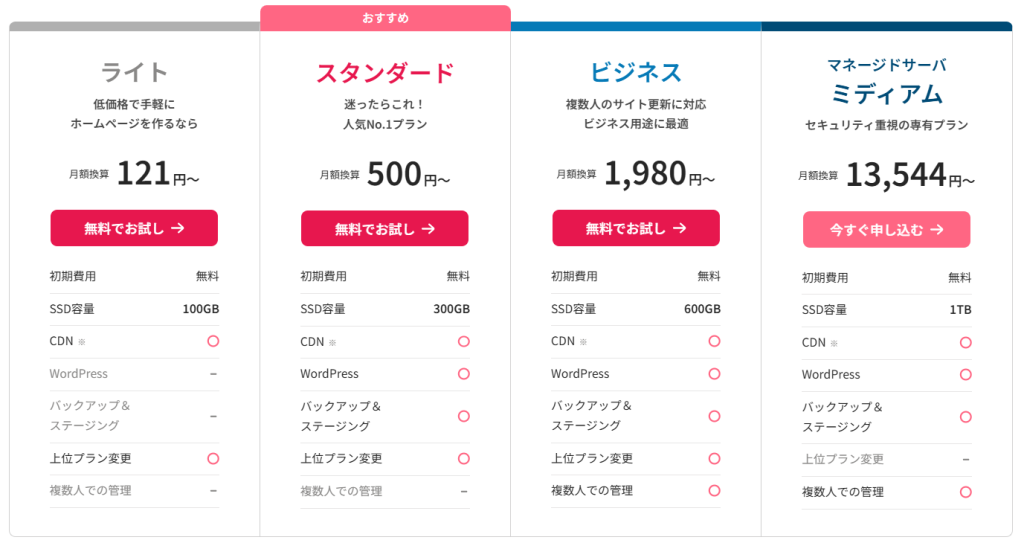 次に、「速度も機能も日々アップデート」「あなたと成長得推し続けるレンタルサーバー」をHPの冒頭で標榜する東証プライム市場上場企業運営の「さくらのレンタルサーバー」さんです。